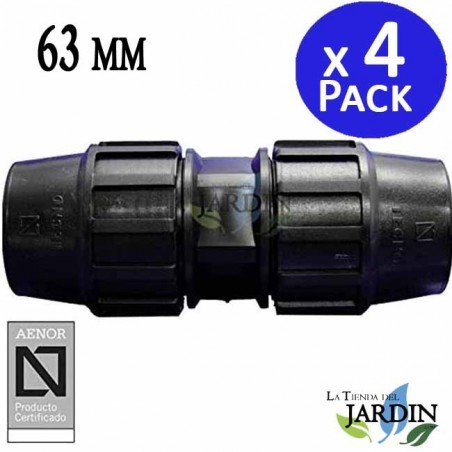 Produkt mit AENOR-Zertifikat zum Verbinden von 63 mm PE-Rohren. 4 Polyethylen-Anschlüsse für 63-mm-Polyethylenrohre. Hochwertiges Material zum Verbinden von Rohren für Sanitär-, Bewässerungs- und Bauzwecke. Ermöglicht die Verbindung zweier Polyethylenrohre. Hergestellt in Spanien. Marke Suinga. Produkt mit Aenor-Zertifikat. Kopien dieses Produkts sind nicht gestattet.
