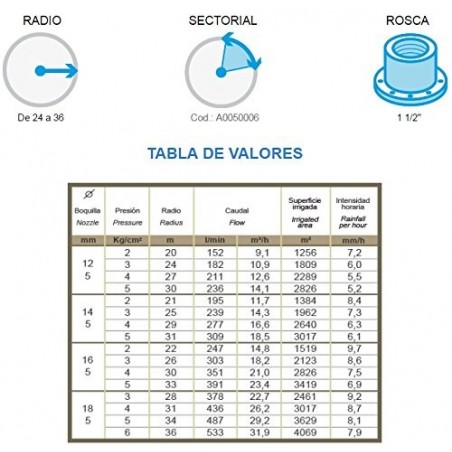 Hidra-Bewässerungskanone mit einer Reichweite von 20 bis 36 Metern und einem Arbeitsdruck von 2 bis 6 bar. Anschluss 1 1/2 Innengewinde. Einstellbarer Bewässerungswinkel. Landwirtschaftlicher Sprinkler aus hochwertigem Metall, langlebig und widerstandsfähig. LaTiendadelJardin bietet die größte Auswahl an landwirtschaftlichen Bewässerungssystemen auf dem Markt.
