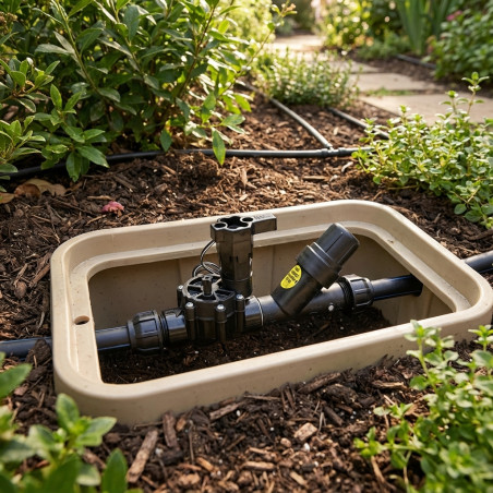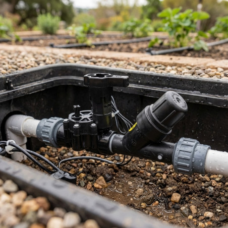 Das Kit enthält ein Ventil und einen Druckregler (RBY-Filter oder PRB-Filter), alles Notwendige, um den Durchfluss zu steuern, zu filtern und den Druck der lokalen Bewässerungsstationen zu regulieren.
