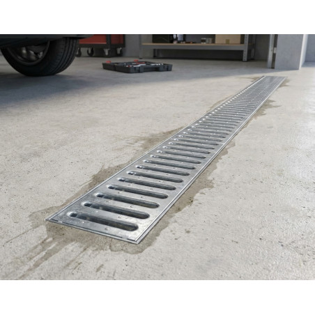 Dieses 100 x 12,8 cm große Garagengitter aus geripptem, verzinktem Stahl dient als Schutzabdeckung für stark frequentierte Bereiche. Es ist robust und langlebig und eignet sich ideal für Küchen und Badezimmer.