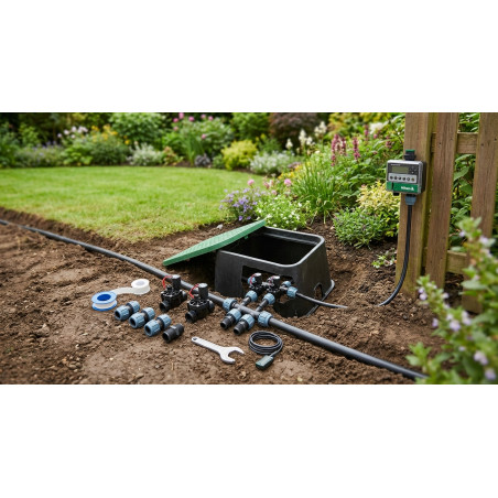 Automatisches Bewässerungsset für die Bewässerung, das folgendes Material enthält: KRain RPS46 4-Zonen-Innenprogrammierer, 2 1" 24-V-Magnetventile, 12 Meter 12 mm Teflon, 3 Verbindungen Außengewinde 32 mm PE, Stopfen, 2 Bewässerungszonensammler, Stahlschlüssel-Anziehbeschlag und mittlere Brust 42x33x20 cm.