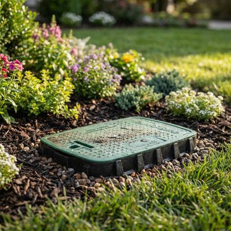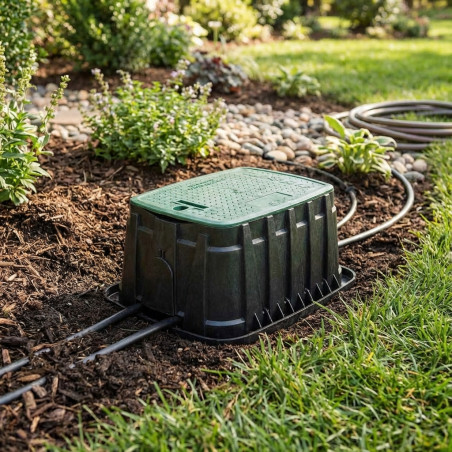 Jumbo Rain Bird VBJMBH Gartenbewässerungskasten von hoher Qualität und Haltbarkeit, der dem Gewicht standhält. Auch sehr nützlich zum Schutz von Absperrhähnen oder Bewässerungshydranten. Länge 70,1 x Breite 53,3 x Höhe 30,7 cm. Kapazität 5-6 Magnetventile, Zubehör oder Filter. Bewässerungsbox der Marke Rain Bird. Inklusive Verschlussschraube.