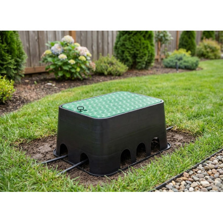 Dieser Ventilkasten zeichnet sich durch seine rechteckige Form aus und eignet sich ideal zur Aufnahme eines oder mehrerer Magnetventile. Er ermöglicht eine saubere und ordentliche Installation. Hergestellt aus robustem, UV-behandeltem Polyethylen, ist er beständig gegen Sonne, Regen und Temperaturschwankungen. Der verstärkte Deckel bietet einfachen Zugang zum Inneren für Inspektionen, Entleerung, Wartung oder Reparaturen des Bewässerungssystems.