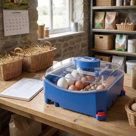 Patentierter professioneller automatischer Inkubator mit reduziertem Energieverbrauch. Der Brutkasten eignet sich zum Ausbrüten von Eiern von Hühnern, Fasanen, Perlhühnern, Wachteln, Rebhühnern, Enten, Enten, Gänsen, Truthähnen, Pfauen, Tauben, Tauben, exotischen Vögeln und Raubvögeln. Kapazität: 0–24 Eier oder 96 kleine Eier (Wachtelart), dank der patentierten universellen Eierhaltezellen.