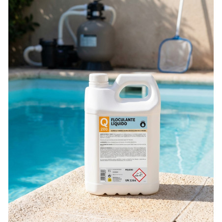 Flüssiges Produkt für Schwimmbäder, das Schwebstoffe bindet und deren Ausfällung bewirkt. Anwendung: Bei ausgeschalteter Filteranlage und ohne Badegäste 10 ml/m³ Wasser zugeben. Die Dosis in einen mit Wasser gefüllten Behälter geben und die Lösung gleichmäßig im Becken verteilen. Nach ca. 8 Stunden die sich am Beckenboden abgesetzte Flockenschicht entnehmen. Anwendung zur Erhaltungsbehandlung: Diese kann mit einer Dosierpumpe durchgeführt werden. Dabei werden 0,5 ml des Produkts pro m³ Umwälzwasser vor dem Filter zugegeben. Zusammensetzung: Aluminiumsulfat-Hydroxidchlorid.