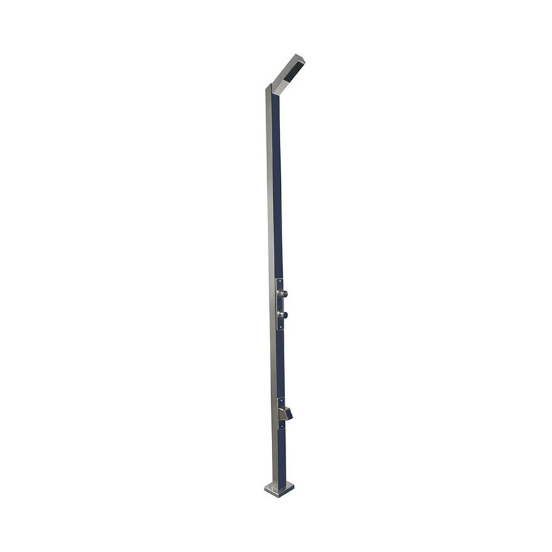 Zeitgesteuerte Dusche mit 1 Strahlrohr und Fußwaschhahn, speziell für den Einbau in Einrichtungen mit hoher Benutzerdichte (öffentliche oder halböffentliche Schwimmbäder). Ausgestattet mit 1 Sprinkler mit zeitgesteuertem Knopf und einem Fußwaschhahn, ebenfalls mit zeitgesteuertem Knopf. Material: Hochfester, polierter Edelstahl AISI-304. Mit Durchflussbegrenzer (Wassereinsparung). Befestigung am Boden mittels Schrauben, mit integriertem Anker.