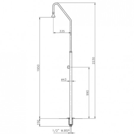 Klassische Designdusche für den Einbau in Schwimmbädern und Gärten. Hergestellt aus poliertem Edelstahl AISI-304 mit einem Rohr mit 43 mm Durchmesser. Modell mit 1 oberen Sprinkler und manuellem Knopfventil zum Öffnen des Durchflusses. Inklusive Anker mit Bodenanschluss zur korrekten Befestigung am Boden. Höhe des Sprinklers zum Boden von 2 Metern.
