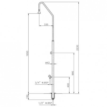Klassische Designdusche für den Einbau in Schwimmbädern und Gärten. Hergestellt aus poliertem Edelstahl AISI-304 mit einem Rohr mit 43 mm Durchmesser. Modell mit 1 oberen Sprinkler, manuellem Knopfventil zum Öffnen des Durchflusses und Fußwaschhahn. Inklusive Anker mit Bodenanschluss zur korrekten Befestigung am Boden. Höhe des Sprinklers zum Boden von 2 Metern.