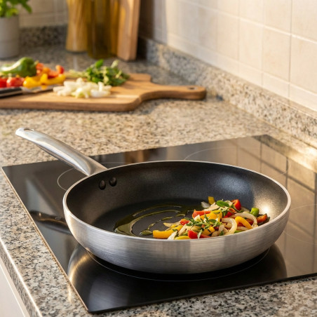 Diese aus hochwertigen Materialien gefertigte Bratpfanne sorgt für gleichmäßige Wärmeverteilung, verhindert Hotspots und garantiert perfekt gegarte Speisen. Der robuste Aluminiumkorpus gewährleistet Langlebigkeit und Stabilität und macht die Pfanne zu einer lohnenden Investition für Ihre Kochutensilien.