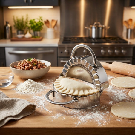 Teigtaschenform aus Edelstahl, 12 cm. Diese Teigtaschenform ist aus hochwertigem Edelstahl gefertigt, langlebig und rostfrei. Sie ist wiederverwendbar und leicht zu reinigen und somit ein zuverlässiges Werkzeug für die Zubereitung köstlicher Teigtaschen. Die Edelstahl-Teigtaschenform eignet sich nicht nur für Teigtaschen, sondern auch für andere leckere Gerichte wie Empanadas, Pasteten und vieles mehr. Ihr vielseitiges Design ist eine praktische Ergänzung für Ihre Küche. Die Teigtaschenform ist einfach und benutzerfreundlich gestaltet und daher sowohl für Anfänger als auch für erfahrene Köche geeignet. Legen Sie einfach den Teigfladen in die Form, geben Sie die gewünschte Füllung hinzu und drücken Sie die Form zusammen, um perfekte Teigtaschen zu erhalten. Mit dieser Edelstahl-Teigtaschenform gelingen Ihnen gleichmäßige und perfekte Teigtaschen in immer der gleichen Größe. Dies garantiert eine einheitliche Zubereitung und Präsentation und lässt Ihre Teigtaschen professionell und appetitlich aussehen. Das Formen von Teigfladen kann zeitaufwändig sein, aber mit dieser Edelstahl-Teigtaschenform sparen Sie Zeit und Mühe. Mit dieser Form können Sie mehrere Teigkugeln gleichzeitig zubereiten und so Ihre Vorbereitungszeit verkürzen. Genießen Sie köstliche, hausgemachte Teigtaschen ganz ohne Aufwand!