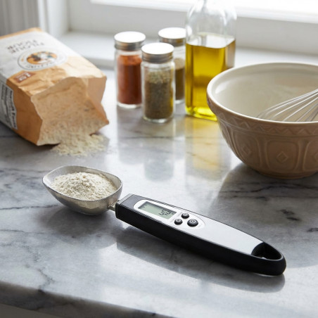 Digitale Wiegelöffelwaage mit wahlweise Gramm oder Unzen. Ideal zum Abwiegen kleiner Mengen wie Hefe, Gewürze, Molke und Öl. Speziell entwickelt für Rezepte, die geringe Zutatenmengen und hohe Präzision erfordern. Messbereich: max. 300 g / Auflösung: 0,1 g. Automatische Abschaltung. Display-Einfrierfunktion. Tara-Funktion. Abnehmbarer Löffel; spülmaschinenfest. Abmessungen: Gesamtlänge mit Griff: 22 x 2,5 cm / Löffel: 6 x 4,5 x 2 cm. Batterie enthalten. Für optimale Messergebnisse empfiehlt es sich, den Löffel auf einer ebenen Fläche zu platzieren.