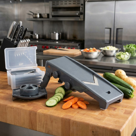 In Profiküchen ist die Mandoline ein ebenso unverzichtbares Werkzeug wie das Messer. Sie ist ideal, um schnell gleichmäßige Stücke zu schneiden und ermöglicht eine Vielzahl perfekter Schnitte, die mit einem Messer unmöglich zu erzielen sind: hauchdünne Scheiben von Gemüse, Salat oder Kartoffeln; gerillte oder gitterförmige Schnitte; Julienne- oder Strohhalme; Wellenschnitte; und Stifte – all dies wertet die Präsentation eines Gerichts deutlich auf. Sie eignet sich auch zum Reiben von Käse, Schokolade und anderen Zutaten.