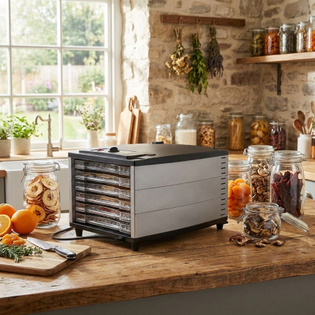 Eine natürliche und einfache Methode, um Obst, Gemüse, Pilze, Fleisch, Fisch etc. mit all ihren Nährstoffen länger haltbar zu machen. Durch die Entwässerung wird der Verderb durch Mikroorganismen verhindert und die Lebensmittel bleiben nährstoffreich. 3D-Heizung: Das Gerät verfügt über ein automatisches 360°-Rotationssystem, in dem die Luft gleichmäßig zirkuliert und durch die Löcher in den Einschüben dringt. Fünf herausnehmbare Einschübe ermöglichen das Trocknen verschiedener großer Lebensmittel, die Joghurtzubereitung etc. Zusätzliches Zubehör zum Trocknen von Soßen und Backen von Keksen ist erhältlich. Digitale Zeitschaltuhr, einstellbar von 30 Minuten bis 48 Stunden.