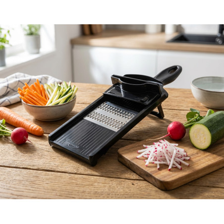 Präzises und effizientes Schneiden : Bidirektionale Mandoline mit ultrascharfen Edelstahlklingen, die homogene und präzise Schnitte garantieren, ideal für 3x3 mm Julienne. Sparen Sie Zeit und Mühe in der Küche.