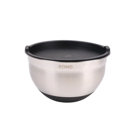 Set mit 3 Salatschüsseln/Rührschüsseln aus 0,6 mm starkem Edelstahl mit Deckel. Hochwertige, rostbeständige Edelstahlschüsseln für einfaches Kochen. Der rutschfeste Boden sorgt dafür, dass sie beim Essen nicht auf der Oberfläche verrutschen. Das Deckelmaterial ist Silikon, ideal zum Aufbewahren von Lebensmitteln, ohne einen Geschmack von Stahl oder Kunststoff zu hinterlassen. Abmessungen: 16 cm, 20 cm und 24 cm