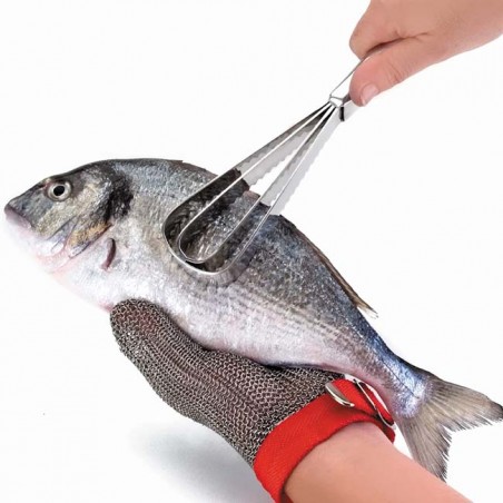 Fischschupper aus Edelstahl 18/10. Dank der gezahnten Klingen am Kopf können Sie den Fisch leicht reinigen und alle Schuppen, auch die kleinsten, entfernen. Abmessungen: 27,5 cm. Spülmaschinenfest und zum Aufhängen geeignet.