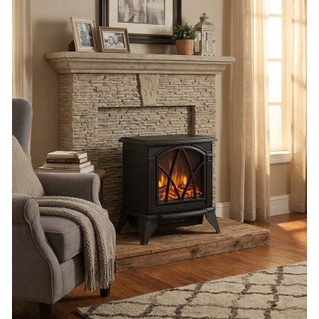 Ein elektrischer Kamin mit Flammeneffekt basiert auf einem System, das eine elektrische Wärmequelle mit einer visuellen Flammensimulation kombiniert. Die meisten dieser Modelle verwenden eine interne Lampe (LED oder Halogen) und ein System aus Spiegeln oder Projektionen, um ein realistisches Bild von Flammen und Glut zu erzeugen. Die Wärme wird über elektrische Widerstände oder einen internen Ventilator erzeugt und wie bei einer herkömmlichen Heizung im Raum verteilt. Simulierte Flammen werden auf der Frontscheibe oder einer reflektierenden Platte angezeigt und sorgen für ein visuelles Kaminerlebnis ohne die Risiken und Komplikationen, die mit einem Holz- oder Gaskamin verbunden sind.