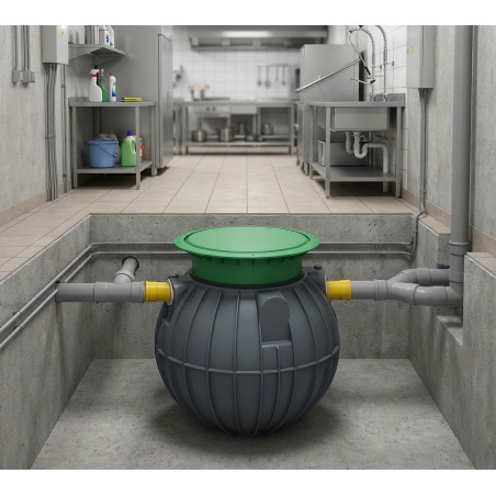 Einfache Installation und minimaler Wartungsaufwand: Dank der Kugelform lässt sich der Behälter schnell und stabil unter dem Boden platzieren. Die Wartung beschränkt sich auf das regelmäßige Entleeren, sobald der empfohlene Fettstand erreicht ist.