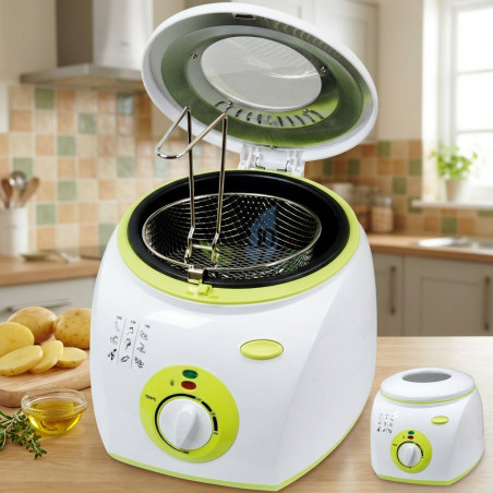 Elektrische Fritteuse mit 2 Litern Ölfassungsvermögen und 1300 W Leistung. Der Thermostat regelt die Temperatur zwischen 80 und 190 °C. Der Frittierkorb hat einen abnehmbaren Griff. Der Deckel verfügt über ein Sichtfenster zur Beobachtung des Frittiervorgangs und rutschfeste Gummifüße für sicheren Stand.