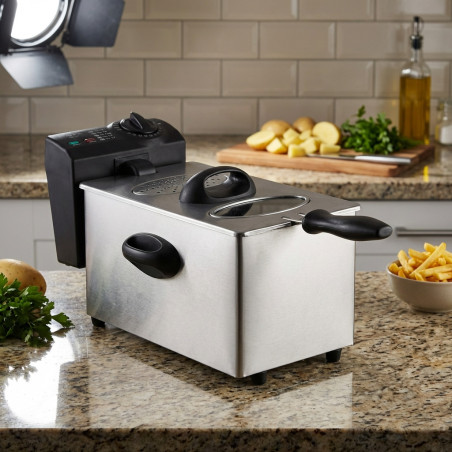 Diese leistungsstarke 2000-Watt-Fritteuse mit 3,5 Litern Fassungsvermögen macht Kochen zum Kinderspiel. Sie verfügt über ein Gehäuse aus poliertem Edelstahl und einen emaillierten Innenbehälter. Dank des Sichtfensters im Deckel können Sie den Frittiervorgang jederzeit beobachten. Ein Dual-Thermostat mit Temperaturregelung bis 190 °C und eine Temperaturanzeigeleuchte sorgen für optimale Kontrolle. Ein Frittierkorb mit wärmeisoliertem Griff ist im Lieferumfang enthalten. Rutschfeste Füße verhindern ein Verrutschen der Fritteuse.