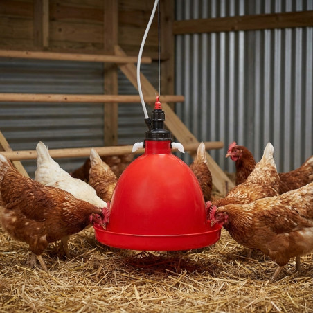 Automatische Tränke für die Hühneraufzucht, hergestellt aus hochwertigem Polyethylen. Es wird direkt an der Wasserversorgung installiert und verteilt dank der Haube das Wasser gleichmäßig, sodass die Hühner ohne Gedränge trinken. Zur Reinigung komplett abnehmbar.