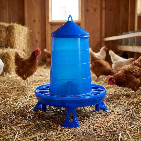 Kunststofftrichter für Hühner und andere Vögel. Sie bestehen aus äußerst widerstandsfähigem Kunststoff, sind leicht und können an jeden Bedarf angepasst werden, ob hängend oder mit Beinen, um sie direkt auf den Boden zu stellen. Der kegelstumpfförmige Tank verhindert, dass das Futter verklumpt und regelmäßig auf den Teller fällt. Die Schale hat eine beträchtliche Höhe und ist nach innen geneigt. Sie verfügt über einen Anti-Abfall-Ring, der verhindert, dass die Vögel das Futter wegwerfen und verschwenden. Der Deckel hilft uns, das Eindringen von Schmutz in das Innere des Tanks zu verhindern und gleichzeitig das Futter in gutem Zustand zu halten. Der verzinkte Stangengriff ermöglicht das Aufhängen und Aufhängen mit der mitgelieferten Schnur in der für Sie bequem erachteten Höhe.
