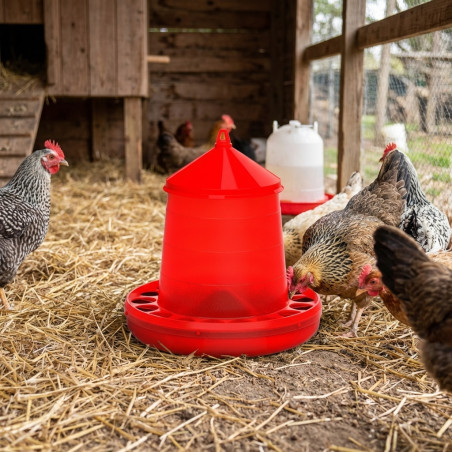 Kunststofftrichter für Hühner und andere Vögel aus hochbeständigem Kunststoff ermöglichen ein geringes Gewicht und können an jeden Bedarf angepasst werden, ob hängend oder mit Beinen, die direkt auf den Boden gestellt werden können. Der kegelstumpfförmige Tank verhindert, dass das Futter verklumpt und regelmäßig auf den Teller fällt. Die Schale hat eine beträchtliche Höhe und ist nach innen geneigt. Sie verfügt über einen Anti-Abfall-Ring, der verhindert, dass die Vögel das Futter wegwerfen und verschwenden. Der Deckel hilft uns, das Eindringen von Schmutz in das Innere des Tanks zu verhindern und gleichzeitig das Futter in gutem Zustand zu halten. Der verzinkte Stangengriff ermöglicht das Aufhängen und Aufhängen mit der mitgelieferten Schnur in der Höhe, die Sie für bequem halten.