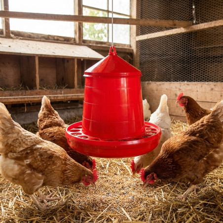 Kunststofftrichter für Hühner und andere Vögel. Sie bestehen aus äußerst widerstandsfähigem Kunststoff, sind leicht und können an jeden Bedarf angepasst werden, ob hängend oder mit Beinen, um sie direkt auf den Boden zu stellen. Der kegelstumpfförmige Tank verhindert, dass das Futter verklumpt und regelmäßig auf den Teller fällt. Die Schale hat eine beträchtliche Höhe und ist nach innen geneigt. Sie verfügt über einen Anti-Abfall-Ring, der verhindert, dass die Vögel das Futter wegwerfen und verschwenden. Der Deckel hilft uns, das Eindringen von Schmutz in das Innere des Tanks zu verhindern und gleichzeitig das Futter in gutem Zustand zu halten. Der verzinkte Stangengriff ermöglicht das Aufhängen und Aufhängen mit der mitgelieferten Schnur in der für Sie bequem erachteten Höhe.