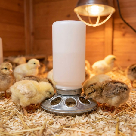 Das Fassungsvermögen dieses Futterautomaten beträgt 1,5 Liter, ideal für Küken im ersten Lebensalter.