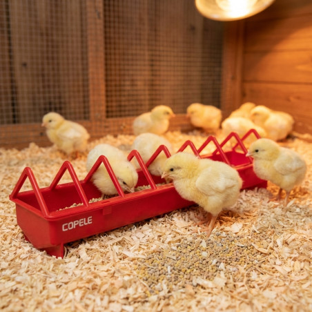 Futterautomat für Küken im 1. Lebensalter , konzipiert in einem Kanalformat, um den Zugang für mehrere Küken zu ermöglichen . Die sitzfeste Kunststoffabdeckung verhindert, dass die Küken das Futter verschmutzen, und dient gleichzeitig als Abfallschutz. Maße 40x8x7 cm