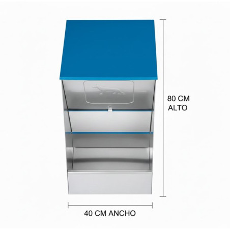Unsere Futtertrichter für Hunde und Katzen sind die beste Alternative, um eine konstante Futterversorgung zu gewährleisten, sie trocken und frisch zu halten und ihr Aroma und ihre Qualität zu bewahren. Komplett aus verzinktem Blech gefertigt. Fassungsvermögen 63 Liter. Hohe Festigkeit und Haltbarkeit für den Innen- und Außenbereich. Maße (Vorderseite, Rückseite, Höhe) 40x35x80 cm. Hohe Qualität. Hergestellt in Spanien.