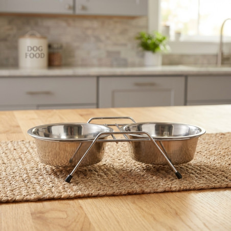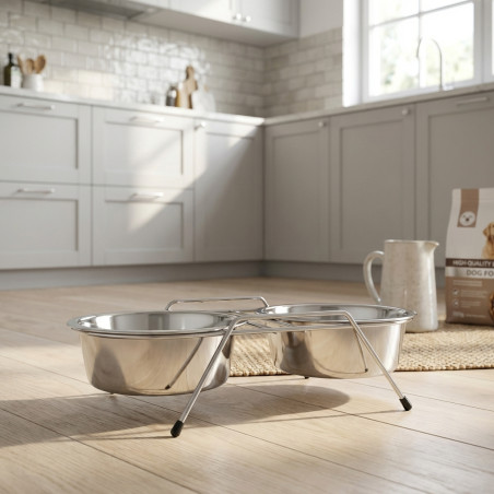 Hundefutterautomat mit zwei doppelten Edelstahlplatten, zur Verwendung als Futter- und Tränke oder als zwei Futtertröge oder zwei Tränken. Praktische und komfortable Lösung, da Sie 2 in 1 haben. Wird auch als Tränke für Tiere verwendet. Fähigkeit. Ø14 cm pro Teller. 0,35 Liter x 2. Maße 29 x 15 x 6 cm. Hochwertiger Futterspender, hergestellt in Spanien.
