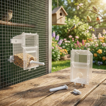 Hochwertiger, transparenter PVC-Futterautomat mit 250 g Fassungsvermögen. Er passt auf alle Käfige mit Einzelnapf-System. Der Automat besteht aus zwei Teilen: einem Befestigungsteil für den Käfig und einem Behälter, der sich dank Führungen einfach anbringen und abnehmen lässt. Zum Befüllen wird der Deckel an der Oberseite angehoben.