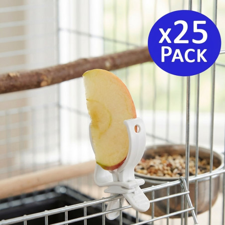 Kunststoffclip, der sich leicht an den Gitterstäben des Käfigs befestigen lässt und für die Aufbewahrung von Obst, Snacks, Gemüse oder allem, was Ihr Haustier sonst noch braucht, konzipiert ist. Es handelt sich um ein widerstandsfähiges und sehr nützliches Zubehör, das für jede Art von Käfig geeignet ist.