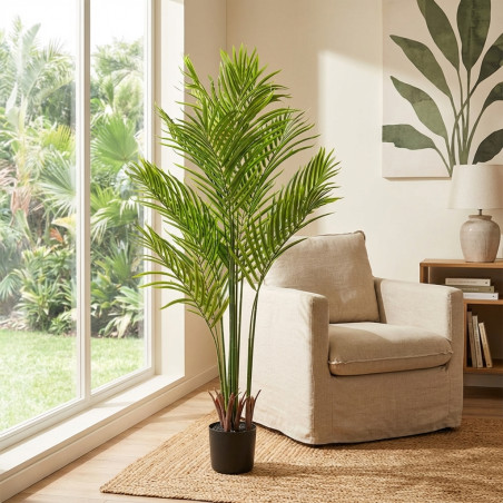 Vergessen Sie Gießen, Schneiden und Sonneneinstrahlung. Diese hochwertige Kunststoffpalme besticht durch ihre majestätische Erscheinung und ihren sofortigen optischen Reiz und behält ihr sattes Grün das ganze Jahr über. Ideal für Wohnzimmer, Büros, Terrassen oder Balkone – sie verleiht Ihrer Einrichtung einen eleganten, tropischen Touch.