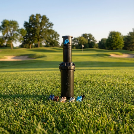 Sprinkler 1 mit einer Reichweite von 11,9 bis 19,8 m und einem Bewässerungswinkel von 360°. Für Sportplätze und große Grünflächen vorgesehen.