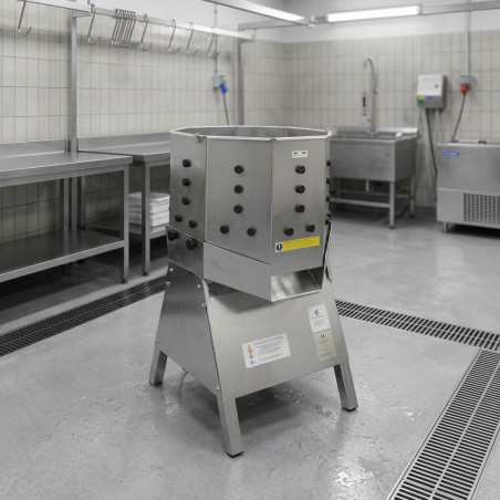 Automatischer Vogelzupfer aus Edelstahl. 1 Jahr Garantie. Hergestellt in Spanien. Wir haben alle Ersatzteile, die Sie für diese Maschine benötigen. Kapazität von 100 Vögeln pro Stunde. Maße 54 x 54 x 95 cm.