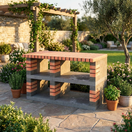 Die Ästhetik von Pan America zeichnet sich durch die Wärme der orangefarbenen Ziegel aus, die einen rustikalen und einladenden Charme verleihen und perfekt durch die Solidität und moderne Oberfläche des Betons ergänzt werden. Diese Materialkombination garantiert nicht nur außergewöhnliche Witterungsbeständigkeit, sondern sorgt auch für eine harmonische Integration in jeden Garten-, Terrassen- oder Balkonstil.