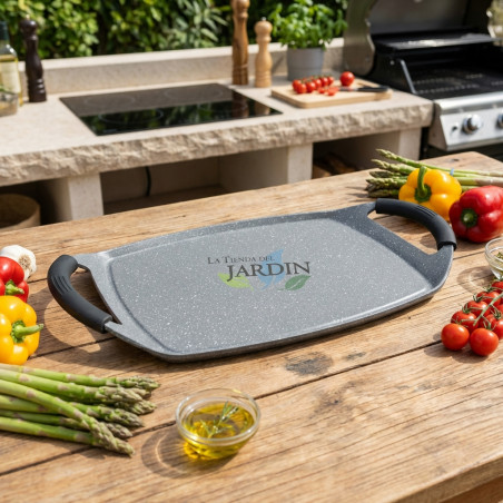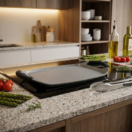 47 cm Induktionskochfeld mit Steinbeschichtung. Antihaftbeschichtet. Hochwertig. PFOA-frei. Hochwertiges Aluminiumguss sorgt für eine längere Lebensdauer im Vergleich zu herkömmlichen Kochfeldern. Doppelte Silikongriffe. Hochwertige Verarbeitung. Gesundes und umweltfreundliches Kochen. Innovatives Design. Geeignet für alle Herdarten: Ceran, Gas, Elektro, Halogen, Induktion usw. Maße: 47 x 29 cm.