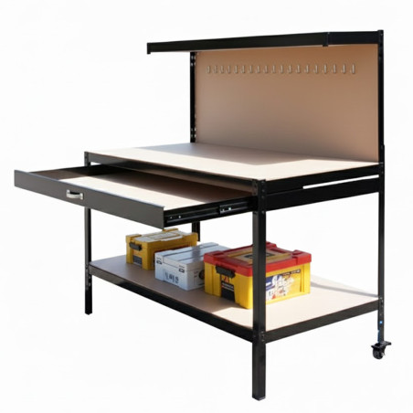 Die geräumige, integrierte Schublade bietet zusätzlichen Stauraum für Werkzeuge, Zubehör und Verbrauchsmaterialien und sorgt so für Ordnung und schnellen Zugriff. Dank ihres robusten, funktionalen und praktischen Designs ist sie die ideale Werkbank für Profis und anspruchsvolle Hobbybastler, die Wert auf Zuverlässigkeit, Organisation und optimale Leistung bei jeder Aufgabe legen.