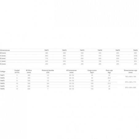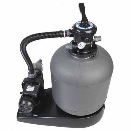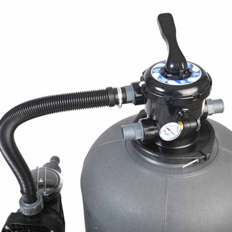 Filter-Monoblock für ein- und oberirdische Pools. Inklusive geblasenem Sandfilter mit 6-Wege-Wahlventil und kompakter selbstansaugender Filterpumpe. Es umfasst außerdem 38- und 50-mm-Anschlüsse für maximale Installationsvielfalt. Erhältlich von Ø380 bis Ø600 mm und verschiedenen Leistungen, um sich an die Wassermenge in jedem Becken anzupassen. Filter aus hochbeständigem thermoplastischem Material (PE mit hoher Dichte), blasgeformt, in eleganter Anthrazitfarbe. 6-Wege-Umschaltventil (Filtration, Waschen, Spülen, Umwälzen, Entleeren und Schließen) mit Manometer, Schauglas, manueller Luftspülung und Wasserspülung. Kompakte selbstansaugende Pumpe mit Vorfilter, 3 Meter Elektrokabel und Stecker. Flexibler Schlauch zum Verbinden von Pumpe und Filter, Anschlüssen, Sockel und Zubehör zur vollständigen Montage der Filterbaugruppe. Inklusive D38- und D50-mm-Anschlusszubehör für maximale Installationsflexibilität (mit Schläuchen oder PVC-Rohr). Arbeitsdruck: 1,2 bar. Maximaler Arbeitsdruck: 2,4 bar. Erfüllt die Filtrationsanforderungen gemäß EN 16713-1.