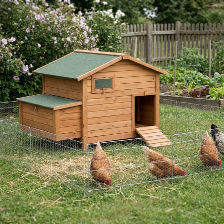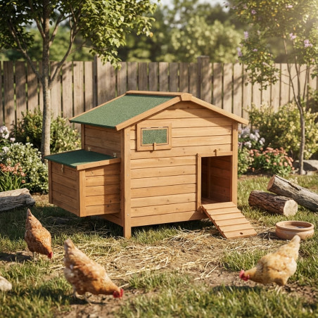 Hölzerner Hühnerstall mit einem vom Boden abgehobenen Nest, um Feuchtigkeit zu vermeiden und die Hühner vor Regen zu schützen. Es enthält Kleiderbügel im Inneren und eine Seitentür, die einen schnellen Zugang zum Nest für Wartungs- und Reinigungszwecke ermöglicht. Hergestellt in Spanien. Maße: Länge 136 cm, Tiefe 90 cm, Höhe 99 cm.