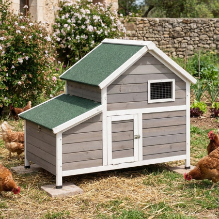 Hühnerstall aus Holz Frankreich . Holzschuppen mit wasserdichtem und lackiertem Dach. Hühnerstall mit Lüftungsfenster und Vordertür für Hühnerzugang. Faltdach zur Wartung des Schuppens. Enthält Beine, die Bodenfeuchtigkeit verhindern. Hergestellt in Spanien. Maße: Länge 119 cm, Tiefe 77 cm, Höhe 98 cm.