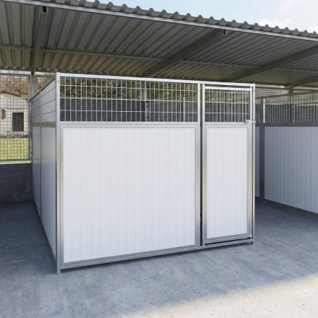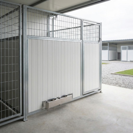 Kombinierte Front für Hundezwinger 200 x 185 cm: Professionelle Lösung für Hundezwinger mit Zugangstür und praktischem, drehbarem Futtertrog. Gefertigt aus 30 mm starken Sandwichpaneelen für optimale Wärme- und Schalldämmung, garantiert sie maximalen Komfort und Sicherheit für Ihr Haustier.