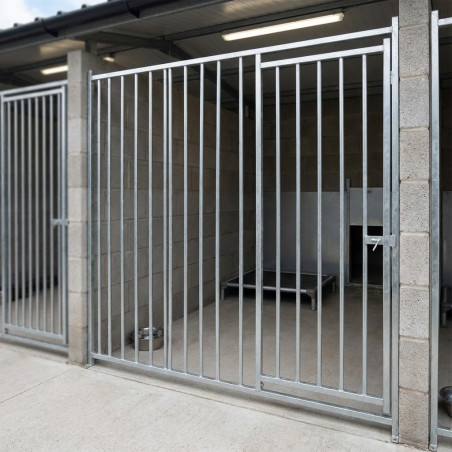 Dieses spezielle Modell zeichnet sich durch ein Gitterdesign aus, das für optimale Belüftung sorgt – unerlässlich für das Wohlbefinden und die Gesundheit Ihres Hundes – und Hitzestau und Feuchtigkeitsbildung verhindert. Der 5 cm große Gitterabstand wurde sorgfältig berechnet, um Sicherheit zu gewährleisten, ohne Sicht oder Luftzirkulation einzuschränken. Es ist die perfekte Wahl für Züchter, Tierheime und Tierhalter, die ihre Einrichtungen mit höchster Qualität und Langlebigkeit ausstatten möchten.