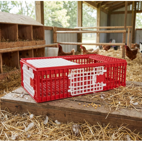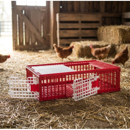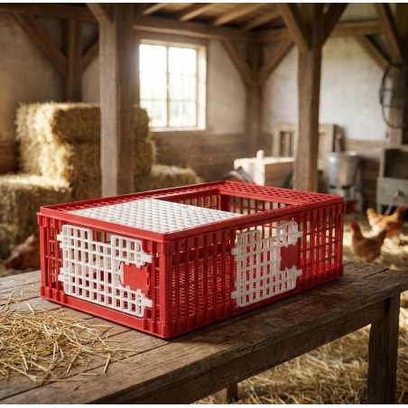 Transportkäfig aus Kunststoff für die Lagerung und den Transport von Hühnern und Vögeln im Allgemeinen. Maße 73 x 52 x 30 cm. Hergestellt in Spanien. Ungefähres Gewicht: 7 kg.