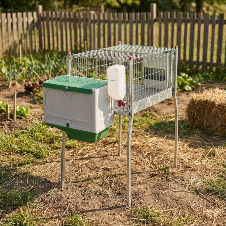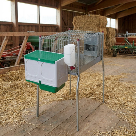 Kaninchenkäfig aus verstärktem verzinktem Draht mit einem Dreiloch-Einfülltrichter mit großer Kapazität (ca. 3 bis 4 kg). Es hat eine Öffnung an der Vorderseite und hat die Möglichkeit, mit oder ohne Beine installiert zu werden und sich mit einem Nest für die Zucht junger Kaninchen anzupassen.