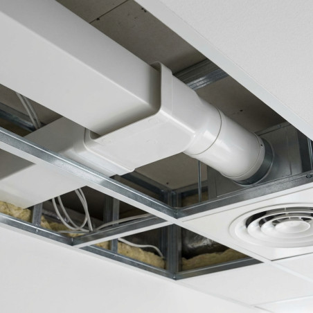 Mischwinkelbogen Vertikal 90º Ø 100mm 55x110 mm | Extraktionszubehör für Lüftungsgeräte und Abluftsysteme | Hohe Effizienz Produktmerkmale: Rechteckiger 90º Bogen von Hoher Qualität – Hergestellt aus feuerfestem und selbstlöschendem Material, widerstandsfähig bis 80ºC, ideal für sichere und effiziente Lüftungssysteme. Design mit Glatter Innenwand – Reduziert Druckverluste und verbessert die Leistung im Vergleich zu herkömmlichen flexiblen Rohren. Höhere Energieeffizienz. Schnelle und Sichere Montage – Männlich-weibliches Verbindungs-System für eine einfache Installation ohne komplexe Werkzeuge. Garantierte Zuverlässigkeit. Kompakt und Vielseitig – Mit nur 55 mm Höhe ideal für Zwischendecken und enge Räume. Kompatibel mit Entlüftungs- und Lüftungssystemen. Anpassungsfähigkeit und Langlebigkeit – Verfügt über rechteckige und runde Befestigungssysteme, resistent gegen Feuchtigkeit und Abnutzung. Lange Lebensdauer ohne Wartung. Maße – Breite: 11 cm, Tiefe: 13 cm, Höhe: 7,5 cm Häufig gestellte Fragen: Ist dieser rechteckige Bogen für Luftaustauschsysteme geeignet? Ja, er ist speziell für Luftaustauschsysteme wie Lüfter und Extraktoren konzipiert. Welche maximale Temperatur kann dieser Bogen aushalten? Der Bogen ist bis 80ºC beständig und ideal für Umgebungen mit mäßigen Temperaturen in Lüftungssystemen. Ist die Installation einfach? Ja, die Montage ist schnell und einfach dank des männlich-weiblichen Verbindungssystems, was die Installation ohne komplexe Werkzeuge erleichtert. Ist dieser Bogen feuchtigkeitsbeständig? Ja, der Bogen ist aus haltbaren Materialien gefertigt, die gegen Feuchtigkeit resistent sind, was ihn zuverlässig in feuchten Umgebungen macht. Kann er in Zwischendecken verwendet werden? Ja, mit nur 55 mm Höhe ist der Bogen perfekt für die Installation in engen Räumen wie Zwischendecken.