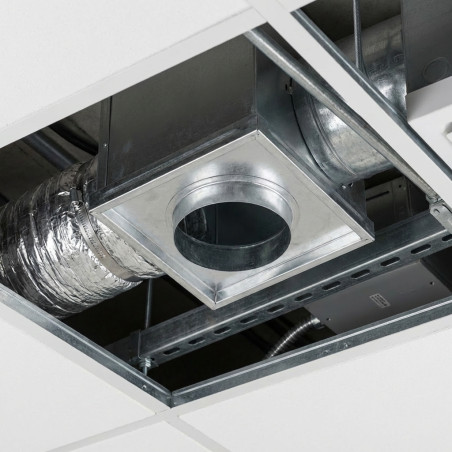 Das Bauteil verfügt über eine optimierte Tiefe, um den Luftstrom zu ermöglichen, ohne übermäßig viel Platz in der abgehängten Decke zu beanspruchen, wodurch die Installation auch an Orten mit geringer Deckenhöhe erleichtert wird.