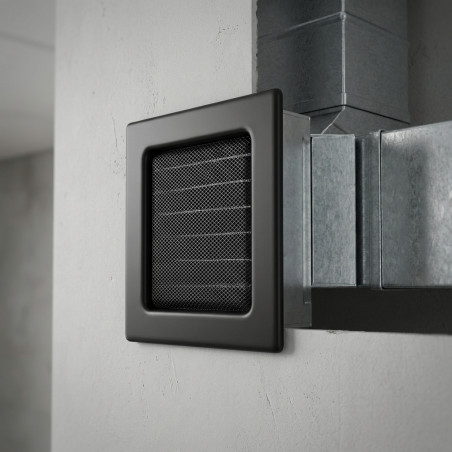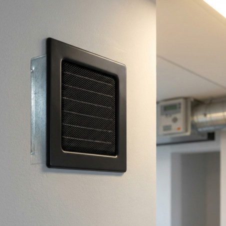 Feststehendes schwarzes Lüftungsgitter 17 x 17 cm : Die ideale Lösung für Lüftungskanäle. Inklusive Vorrahmen für einfache Montage, effizienten Lamellen und einem Schutzgitter gegen Insekten und Staub. Modernes und langlebiges Design.